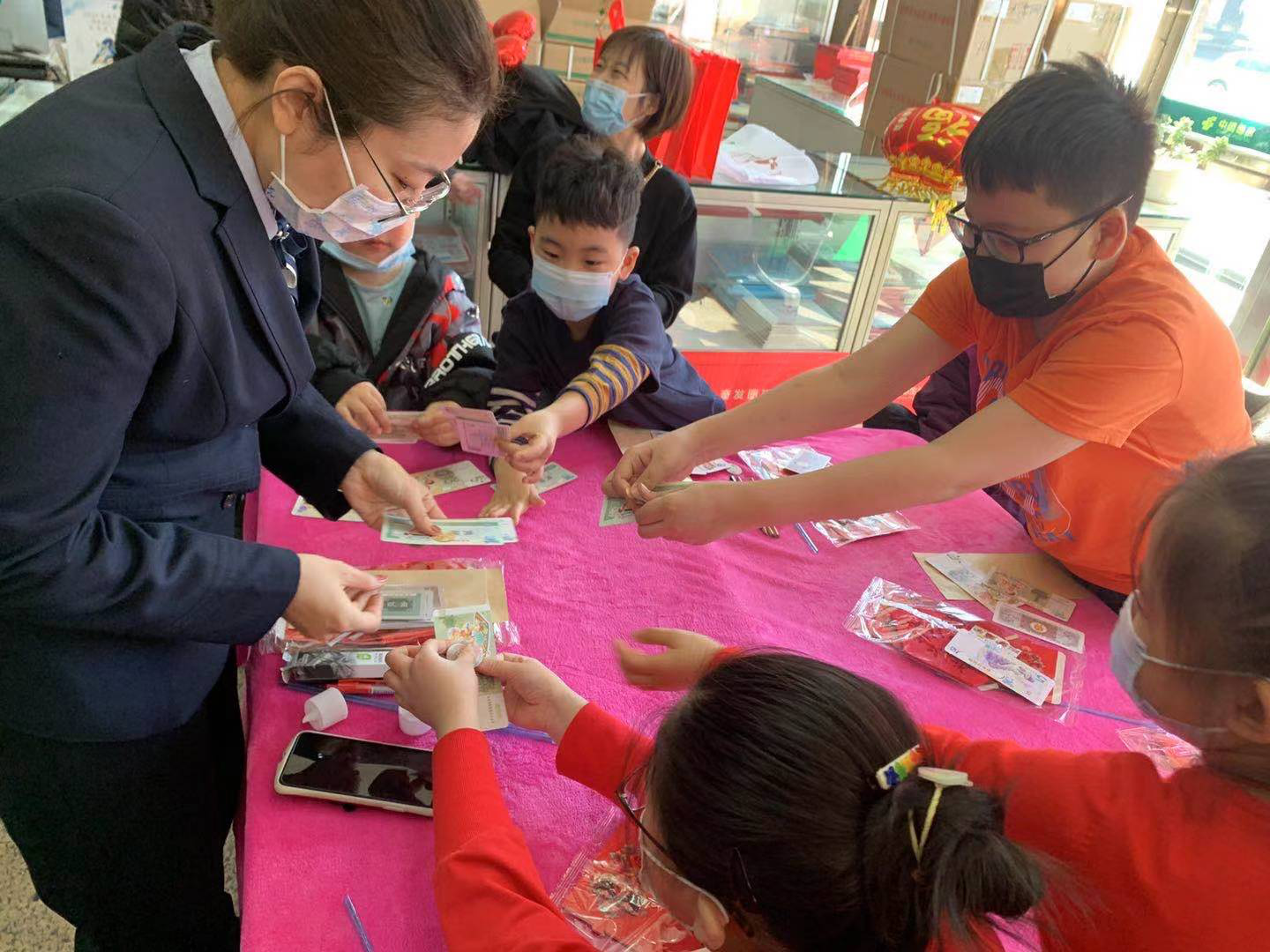 在“财商欢乐行”环节中网点工作人员向小朋友们介绍了货币知识、讲解了压岁钱的使用方法,并带领小朋友们做起实践小游戏--互动购物,最后为每一位“小银行家”颁发金融知识小达人奖状。