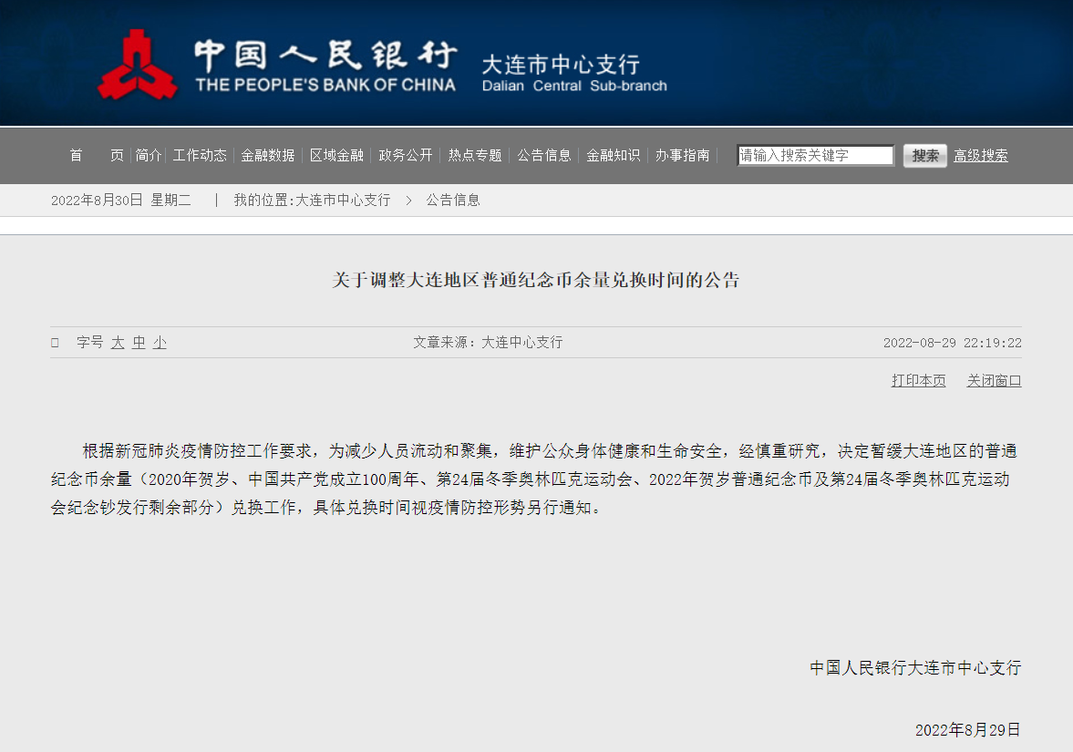 根据大连市新冠肺炎疫情防控工作要求,为减少人员流动和聚集,维护公众身体健康和生命安全,经慎重研究,决定暂缓大连地区的普通纪念币余量(中国共产党成立100周年普通纪念币、第24届冬季奥林匹克运动会普通纪念币、2022年贺岁普通纪念币及第24届冬季奥林匹克运动会纪念钞发行剩余部分)兑换工作,具体兑换时间及相关要求视疫情防控形势另行通知。敬请关注“邮储银行大连分行”微信公众号或官方网站。