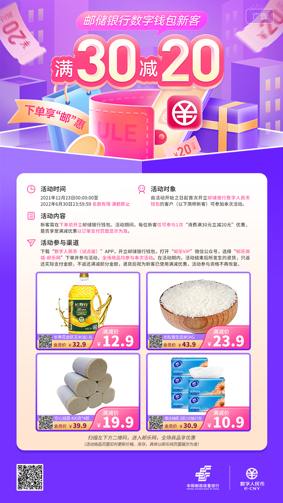 下载“数字人民币(试点版)”APP,开立邮储银行钱包,打开“邮乐VIP”微信公众号,选择“邮乐商城-邮乐网”下单并参与活动,全场商品均参与活动。