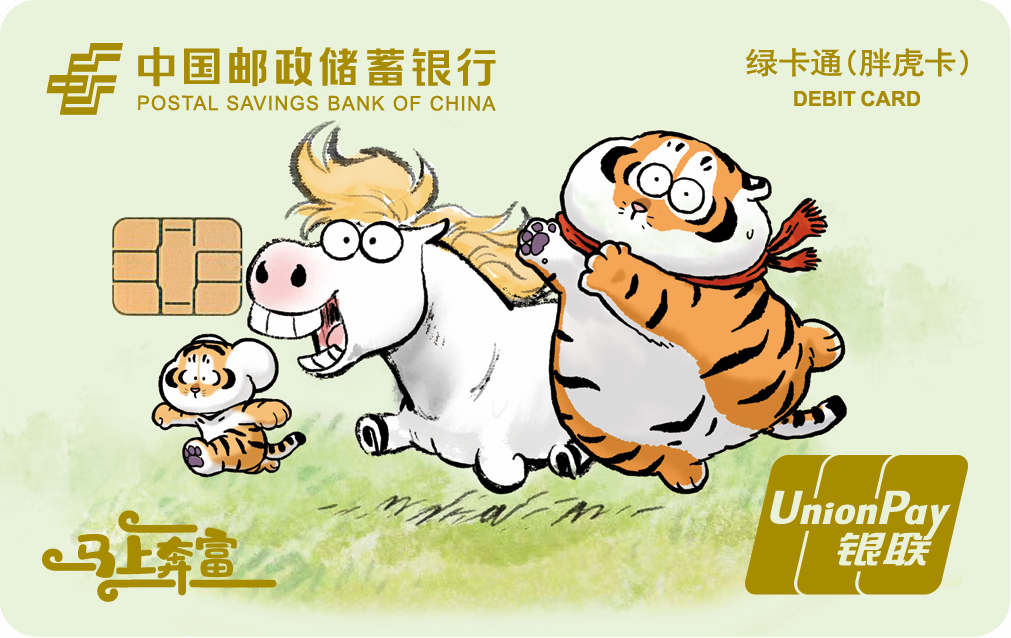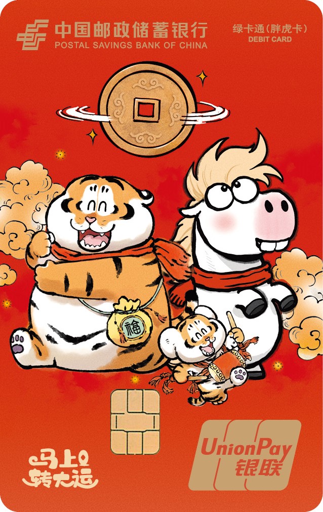 胖虎卡是中国邮政储蓄银行联合IP“我不是胖虎”,设计发行的全国性联名借记卡产品,该系列卡产品共17个版面,包括16款标准版面、1款异形卡面(各网点具体发行卡面,以各发行渠道信息为准)。该系列卡产品可提供我行标准绿卡通 IC 卡全部金融服务功能。同时,客户开户激活、消费达标、资产达标及业务加办等符合条件时可获得老虎邮进行衍生品或云闪付红包等权益兑换。