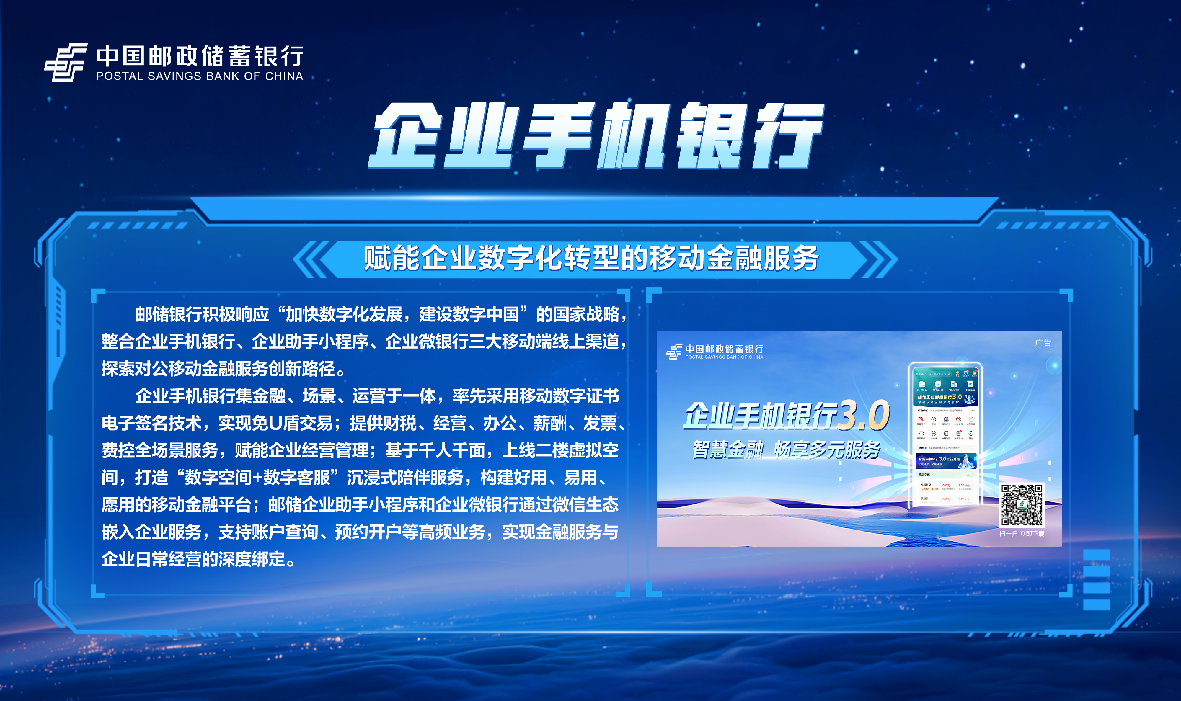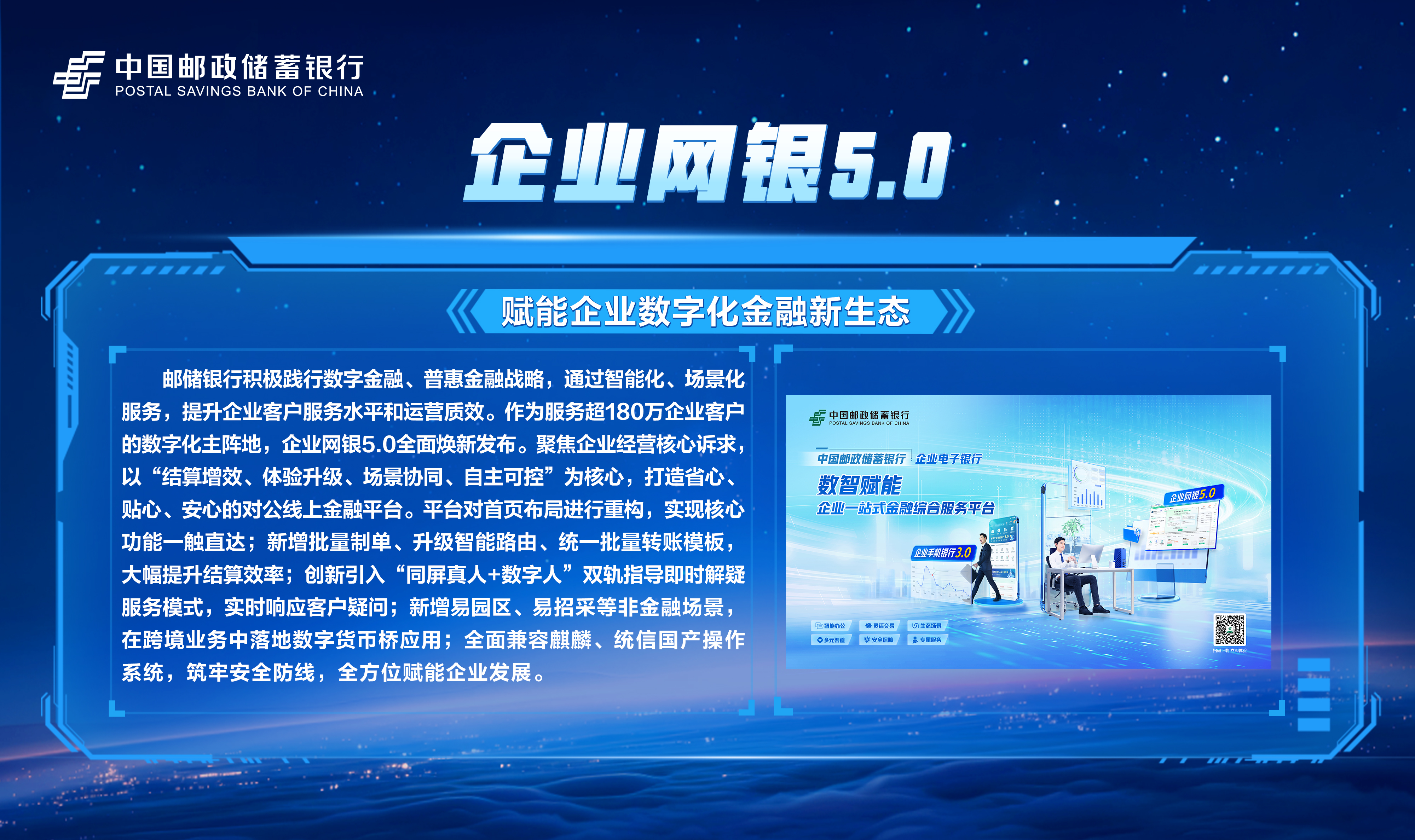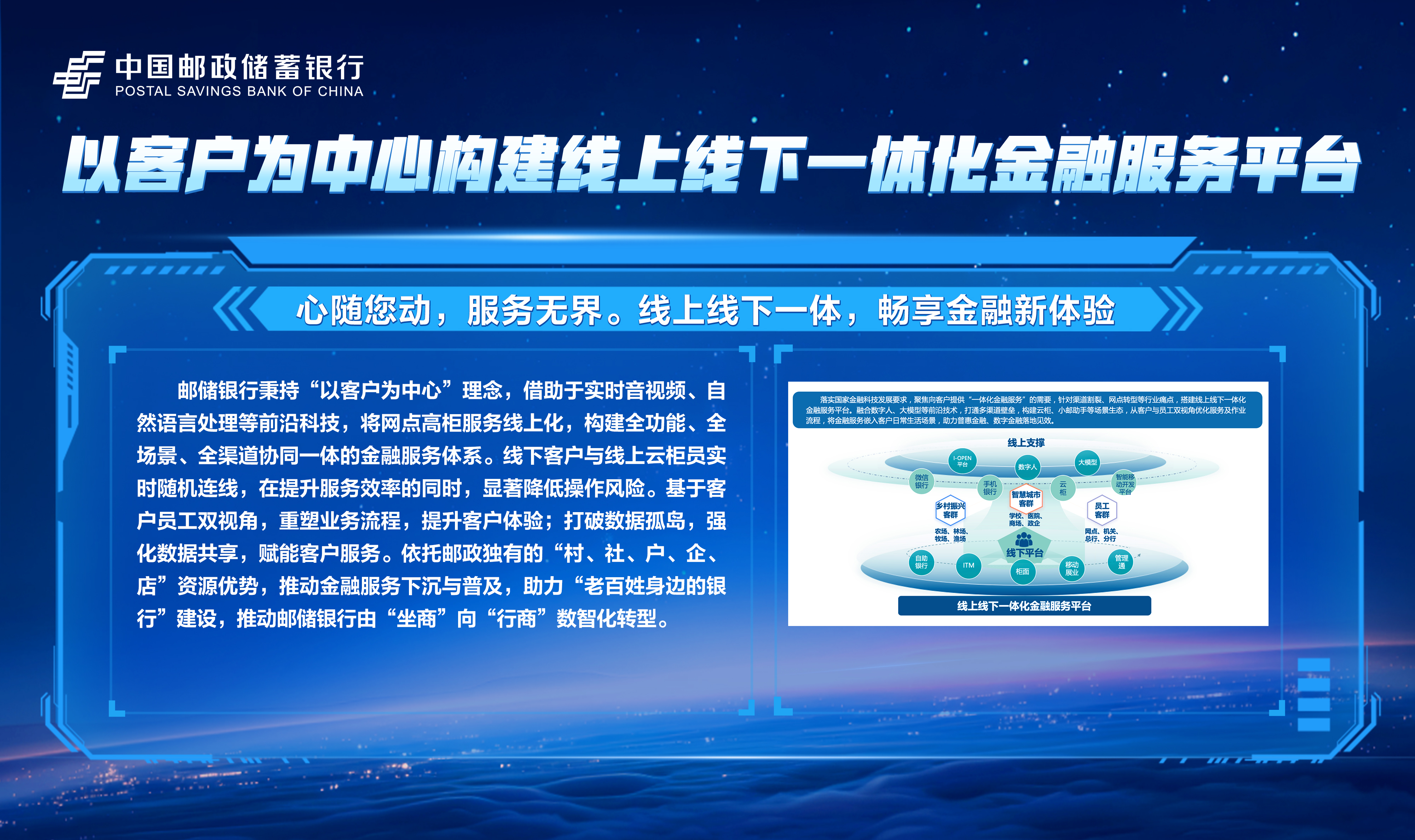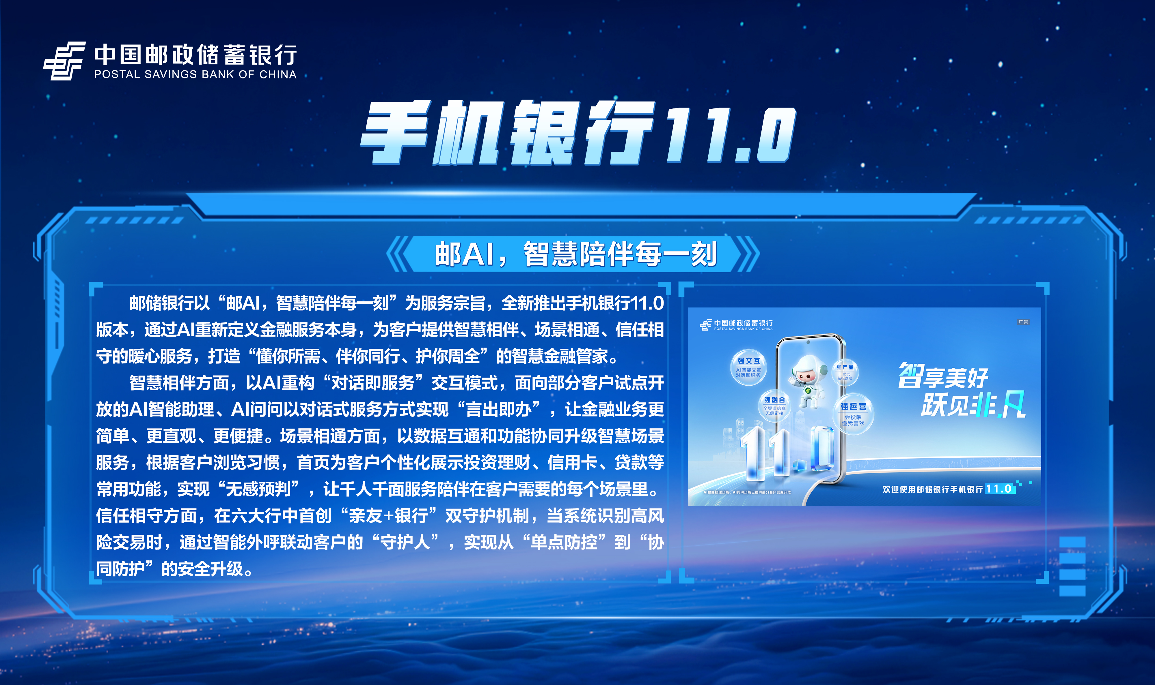 邮储数字金融大会暨手机银行11.0发布会隆重举行!本次大会主题为“开启数字邮储i∞纪元”。三载同行,初心不改,自2023年“拥抱数字邮储i时代”战略初探,到2024年“书写数字邮储@i时代”的实践初行,我们始终拥抱科技浪潮,以AI之笔,绘就邮储数字金融新图景。今年,我们将发布“AI2ALL”数字生态、手机银行11.0版本等服务成果,全方位呈现邮储银行在数字金融领域的创新突破与实践进展。诚邀您与我们共同见证这一重要时刻,携手开启数字邮储的无限新纪元!