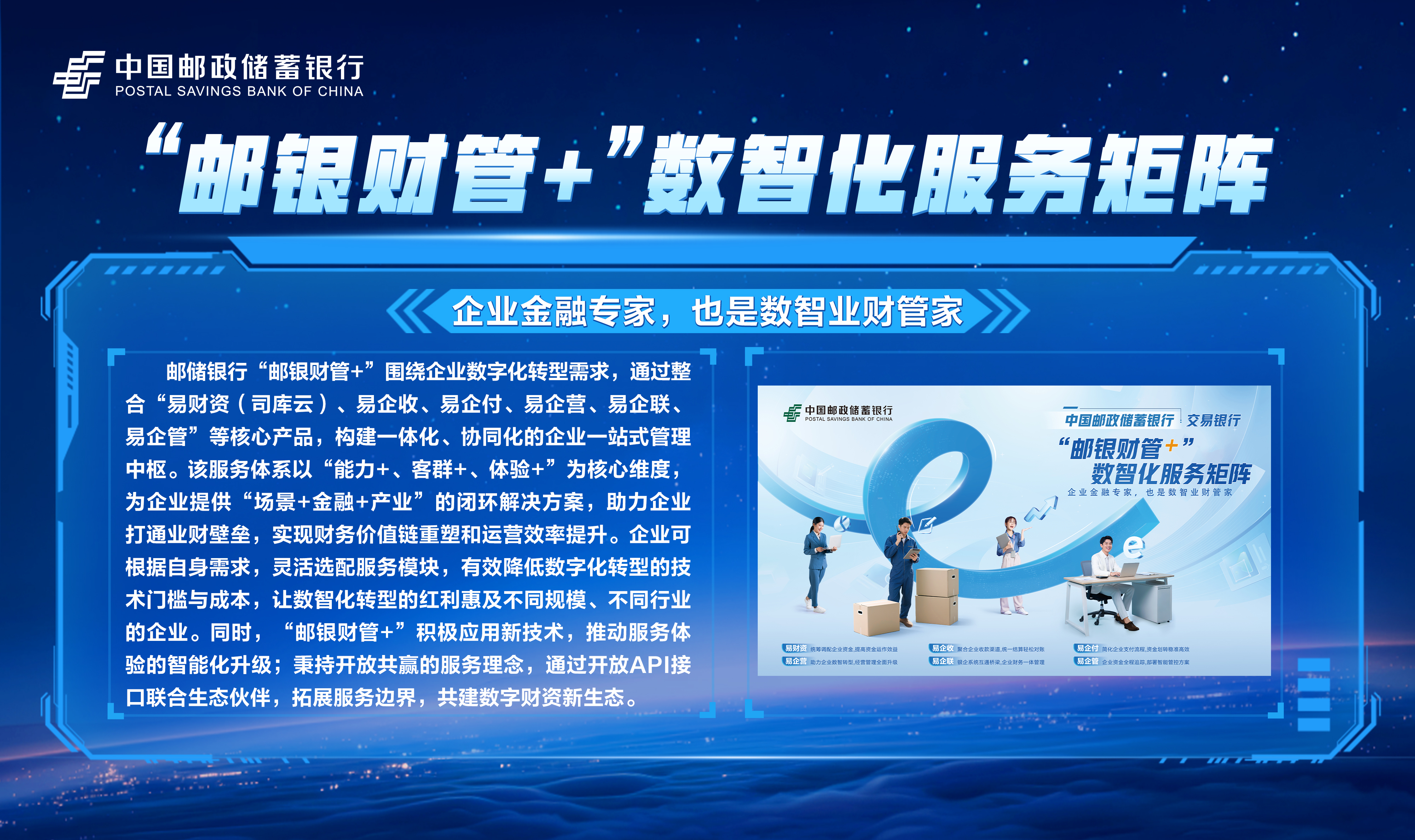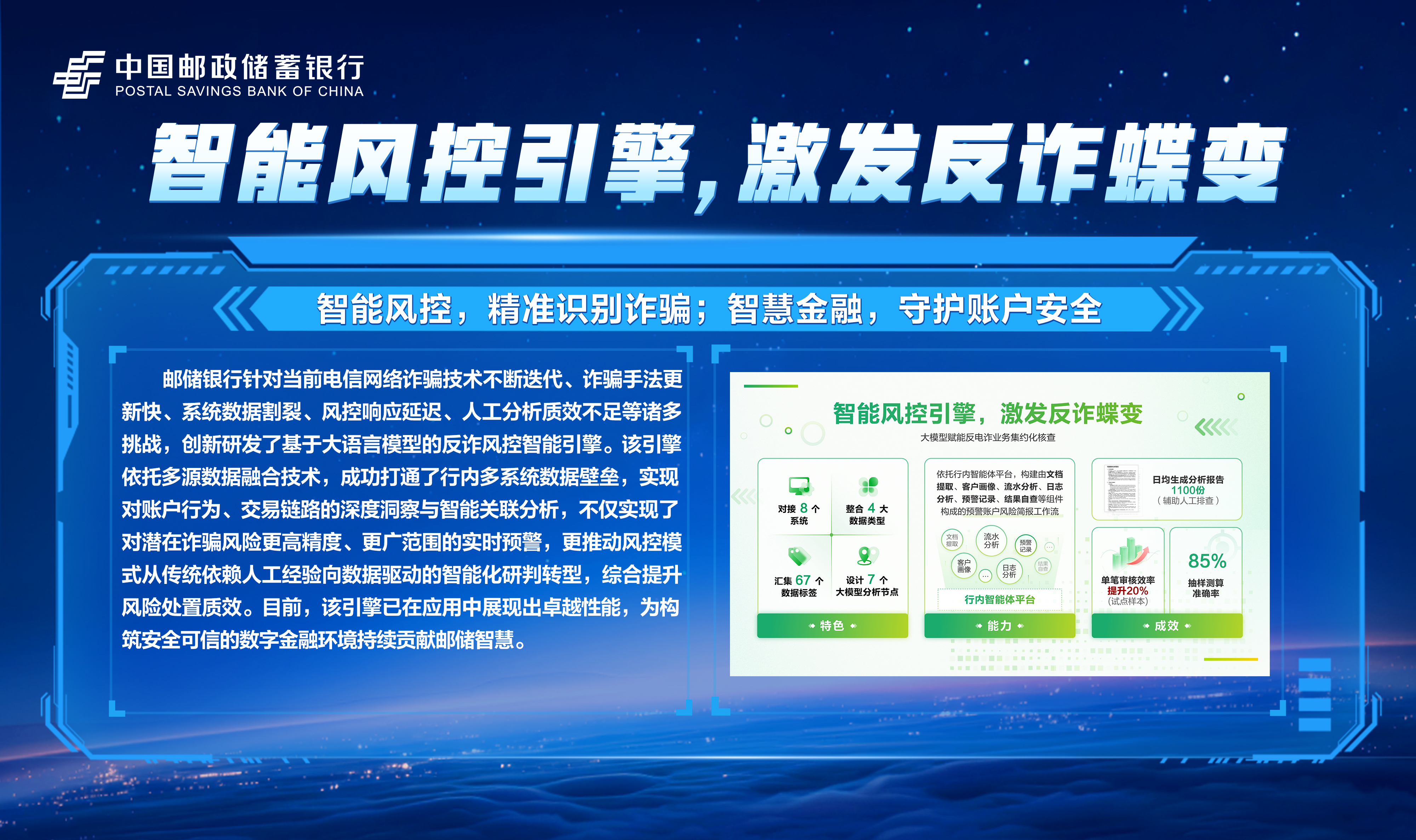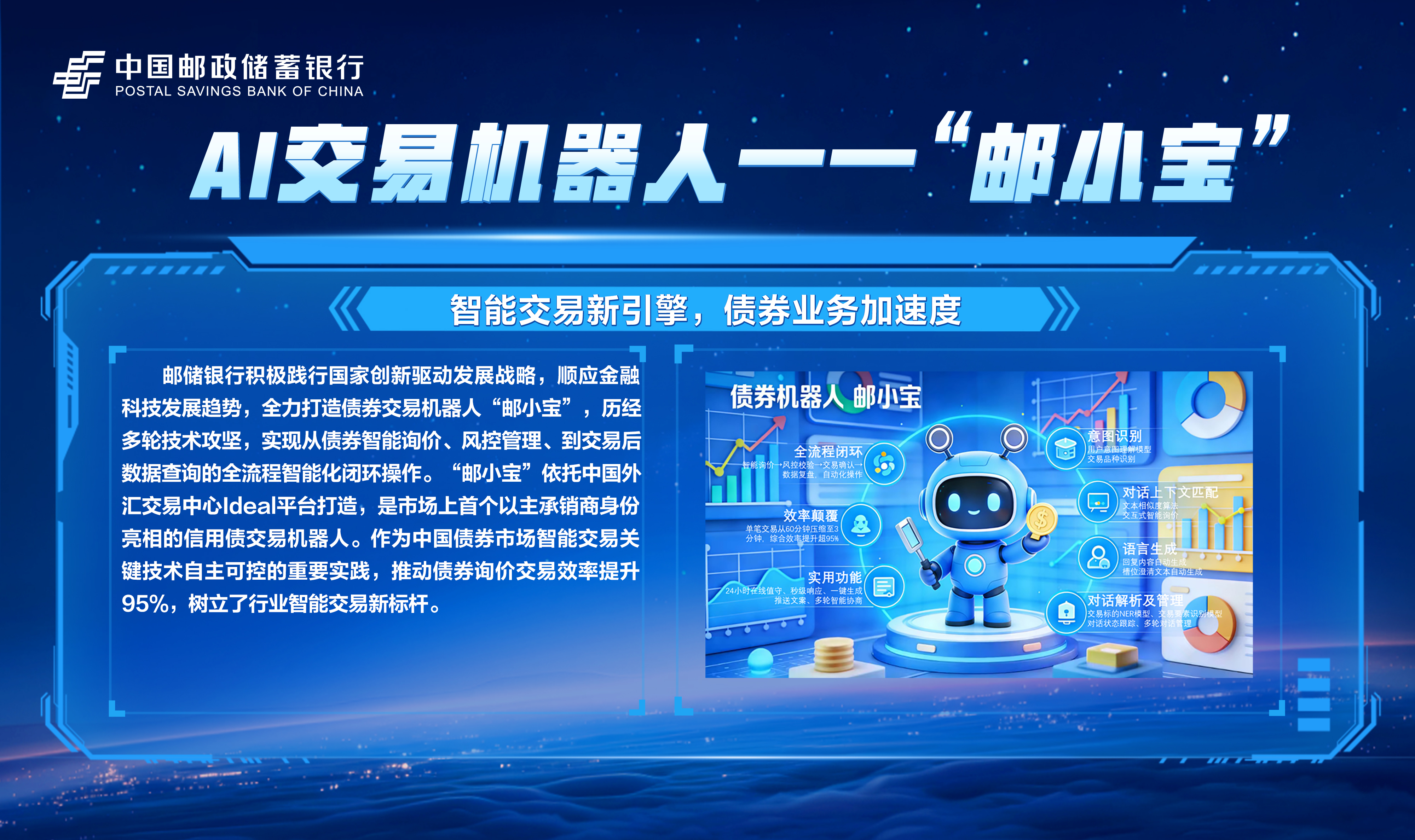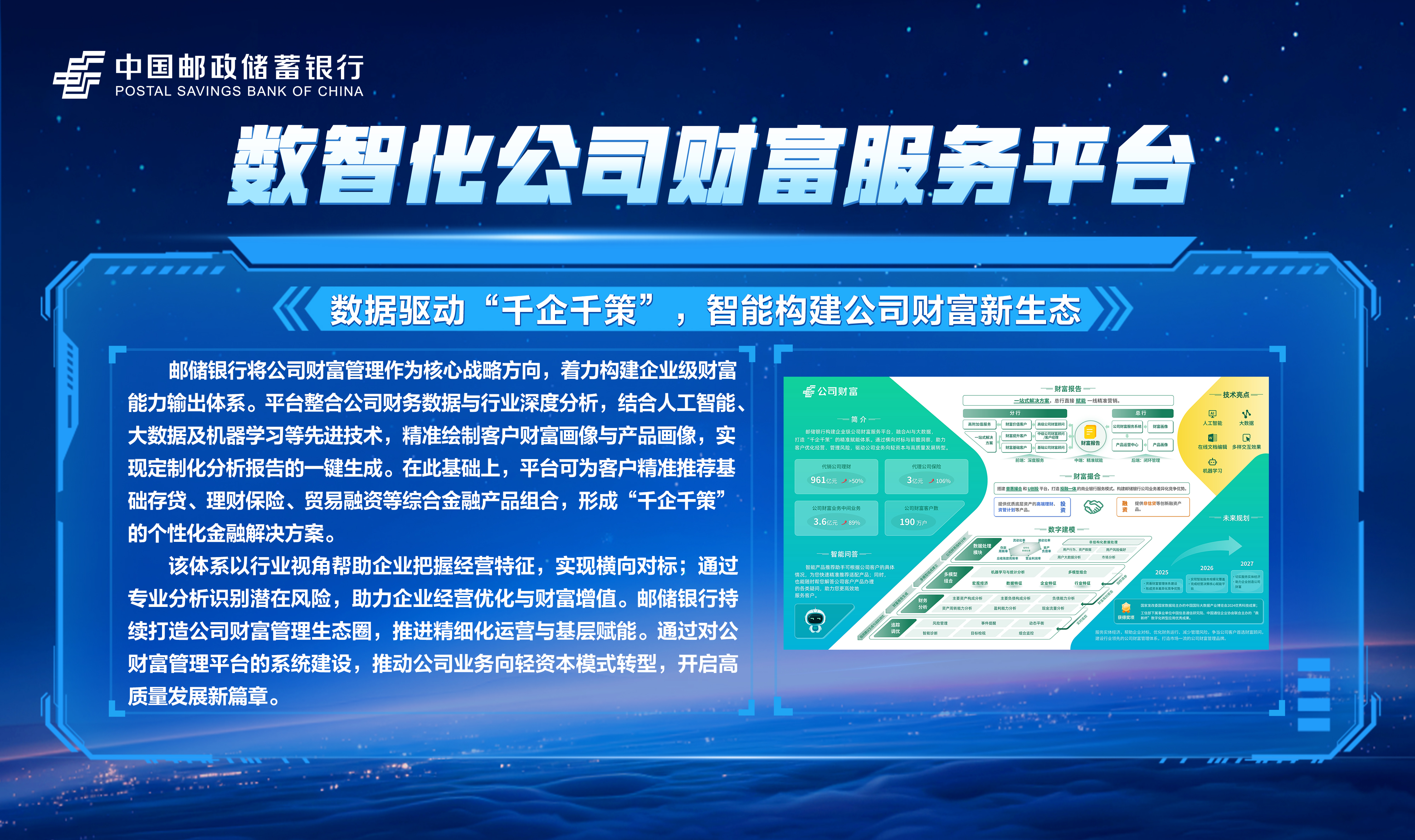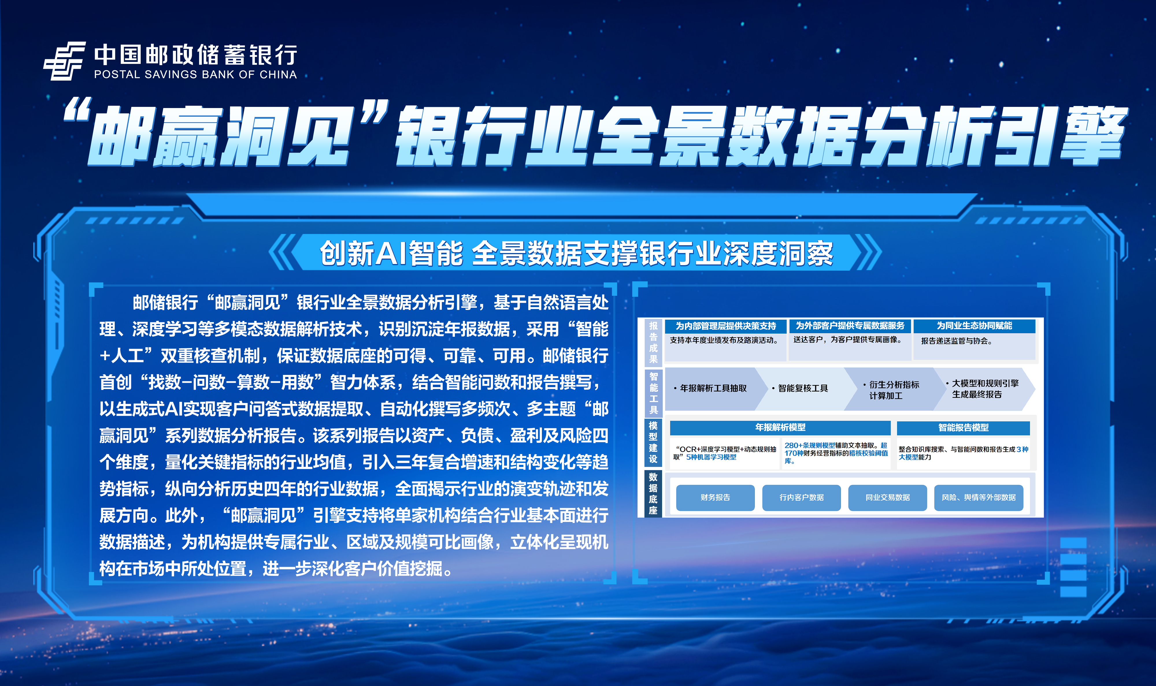 邮储数字金融大会暨手机银行11.0发布会隆重举行!本次大会主题为“开启数字邮储i∞纪元”。三载同行,初心不改,自2023年“拥抱数字邮储i时代”战略初探,到2024年“书写数字邮储@i时代”的实践初行,我们始终拥抱科技浪潮,以AI之笔,绘就邮储数字金融新图景。今年,我们将发布“AI2ALL”数字生态、手机银行11.0版本等服务成果,全方位呈现邮储银行在数字金融领域的创新突破与实践进展。诚邀您与我们共同见证这一重要时刻,携手开启数字邮储的无限新纪元!