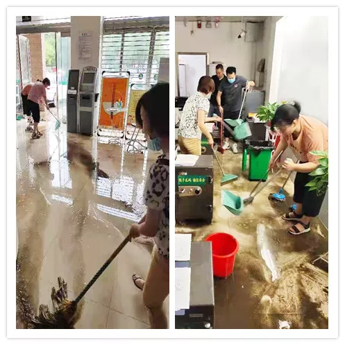 暴雨过后,邮储银行开封市分行中心支行进水。为排除网点安全隐患,尽快恢复正常营业,7月21日一大早,开封市分行本部及中心支行广大干部员工投入到网点清理工作中。为了提高效率,工作人员分工协作,清理积水、扫除垃圾、拖干地面,不放过每一个角落。在众人的努力下,进水网点被打扫得干干净净,玻璃门窗擦洗得清清爽爽,设备检修平稳有序,为恢复营业提供了一个安全、干净、整洁的服务环境。