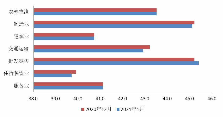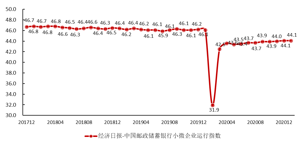 2021年1月份,“经济日报-中国邮政储蓄银行小微企业运行指数”(见图1)为44.1,与上月持平。