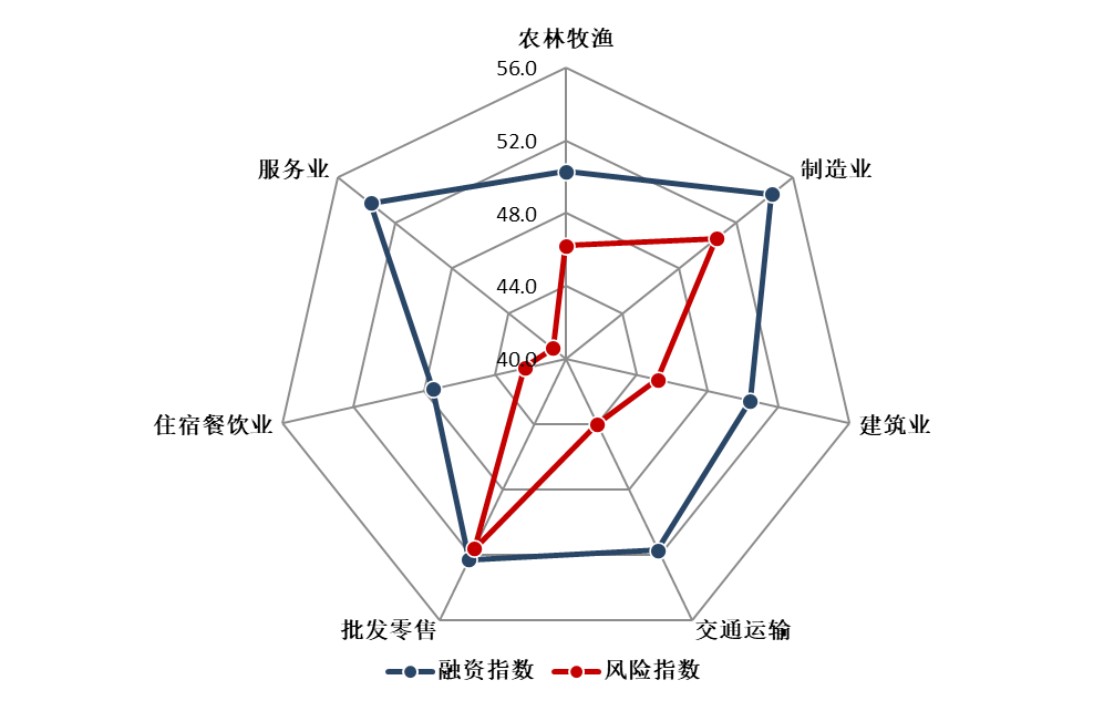1月农林牧渔业小微企业融资指数为50.3,下降0.2个点;制造业小微企业融资指数为54.5,下降0.1个点;建筑业小微企业融资指数为50.4,下降0.1个点;交通运输业小微企业融资指数为51.7,与上月持平;批发零售业小微企业融资指数为52.3,上升0.2个点;住宿餐饮业小微企业融资指数为47.5,上升0.1个点;服务业小微企业融资指数为53.7,下降0.1个点。