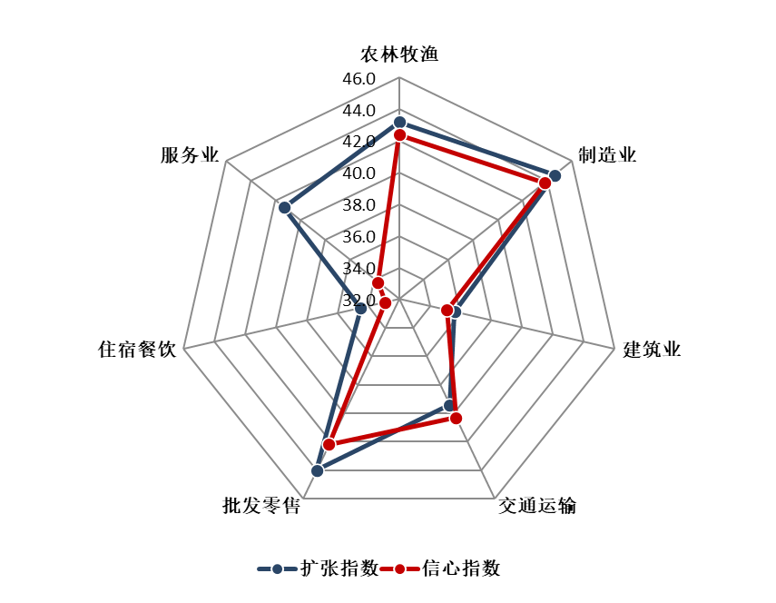 1月小微企业信心指数为41.0,下降0.1个点。分行业来看,除农林牧渔业和建筑业上升外,其他行业的小微企业信心指数均有所下降。其中,农林牧渔业小微企业信心指数为42.4,上升0.6个点;制造业小微企业信心指数为43.8,下降0.1个点;建筑业小微企业信心指数为35.1,上升0.1个点;交通运输业小微企业信心指数为40.3,下降0.2个点;批发零售业小微企业信心指数为42.2,下降0.1个点;住宿餐饮业小微企业信心指数为32.9,下降0.3个点;服务业小微企业信心指数为33.7,下降0.2个点。
