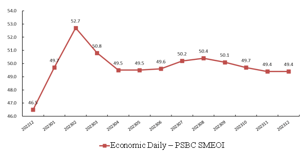 In December 2023, the Economic Daily – PSBC Small and Micro-sized Enterprise Operating Index (Fig. 1, hereinafter referred to as “SMEOI”) reported 49.4, the same as the previous month. The index stayed within the contraction range for three month since October. However, the continuing decline since August ended this month, marking that the overall performance of micro and small enterprises began to stabilize.