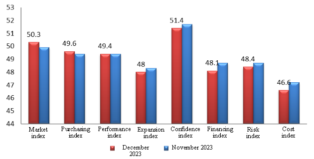 Two out of the eight subindices increased, five decreased, and one remained unchanged in October (Fig. 2). Specifically, the market index was 50.3, up 0.4 point; the purchasing index stood at 49.6, up 0.2 point; the performance index registered 49.4, on par with last month; the expansion index read 48, down 0.3 point; the confidence index posted 51.4, down 0.3 point; the financing index recorded 48.1, down 0.6 point; the risk index closed at 48.4, down 0.3 point; and the cost index was 46.6, down 0.6 point.
