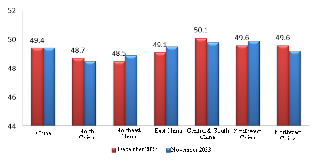 Three out of the six regional indices increased, and the other three decreased (Fig. 3). Specifically, the North China index reported 48.7, up 0.2 point; the Northeast China index registered 48.5, down 0.4 point; the East China index read 49.1, down 0.4 point; the Central & South China index posted 50.1, up 0.3 point; the Southwest China index decreased by 0.3 point to 49.6; and the Northwest China index rose by 0.4 point to 49.6.