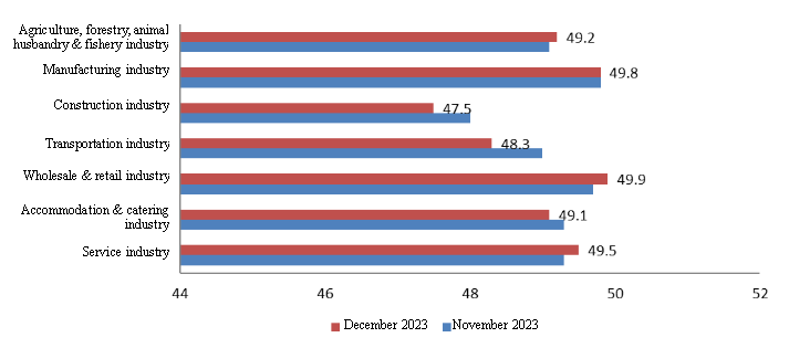 Three out of the seven industry indices increased, three decreased, and the remaining one remained unchanged (Fig. 4). Specifically, the index of the agriculture, forestry, animal husbandry & fishery industry reported 49.2, up 0.1 point; that of the manufacturing industry posted 49.8, the same as last month; that of the construction industry stood at 47.5, down 0.5 point; that of the transportation industry registered 48.3, down 0.7 point; that of the wholesale & retail industry went up by 0.2 point to 49.9; that of the accommodation & catering industry decreased by 0.2 point to 49.1, and that of the service industry reported 49.5, up 0.2 point.